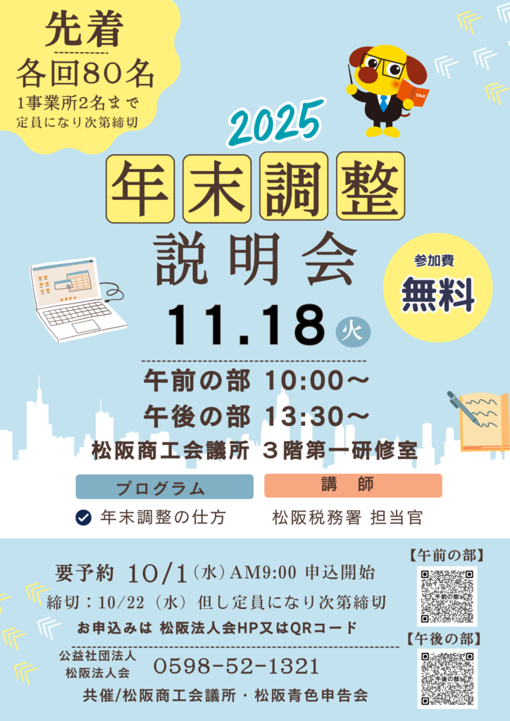 松阪商工会議所及び松阪青色申告会と共催で年末調整説明会を開催いたします。