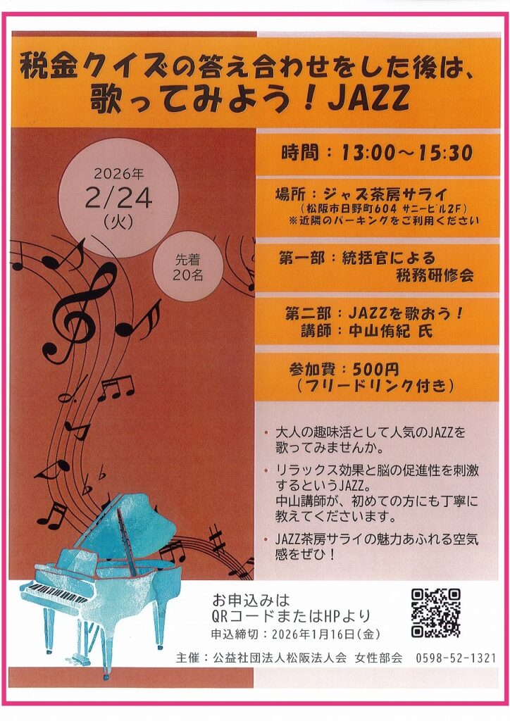 JAZZ茶房サライにて松阪税務署統括官による税務研修会を開催します。