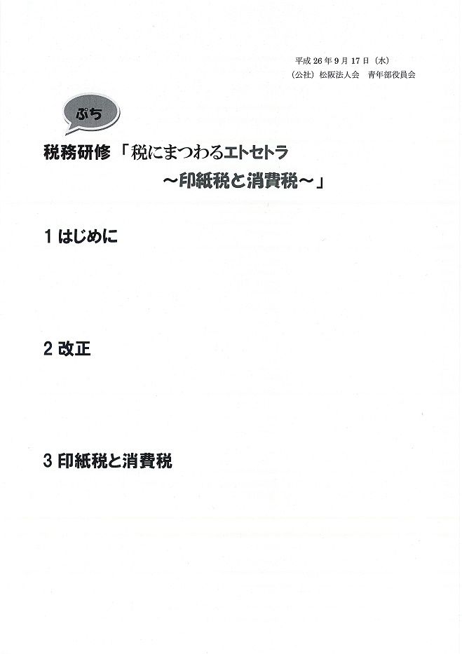 (青)ぷち 税務研修を開催 2014年9月17日(水) 役員会に引き続き 山澤統括官による ”ぷち 税務研修会” テーマ「税にまつわるエトセトラ~印紙税と消費税~」 Q&A 印紙税額は? 統括官からの 設問に えっ?? わからんなぁ