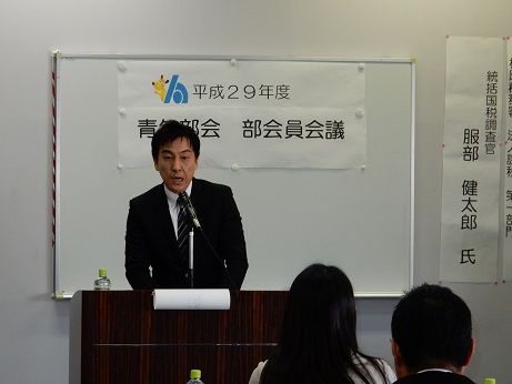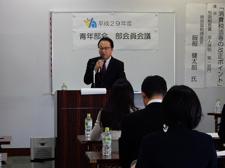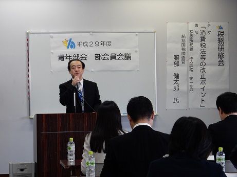 部会員会議に引き続き、税務研修会が開催されました。講師は松阪税務署 法人課税第一部門 統括国税調査官 服部健太郎氏です。