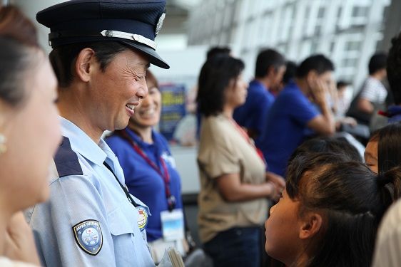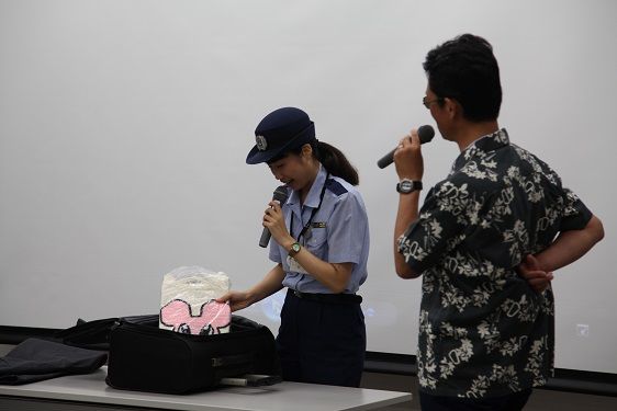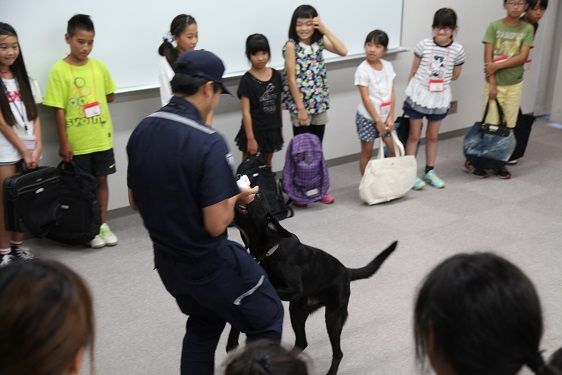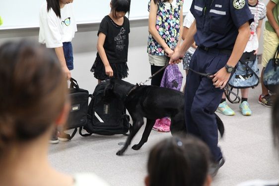 そしていよいよ麻薬探知犬の登場です。子ども達も保護者の方も興味津々。麻薬の臭いをちゃんと嗅ぎ分けて、怪しい荷物の前にお座りする麻薬犬に拍手です![]()