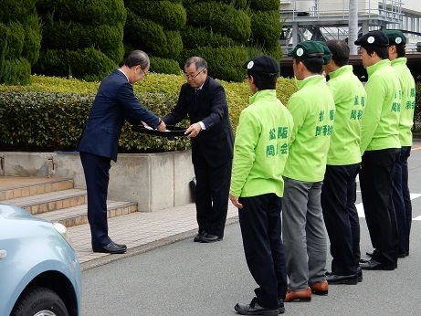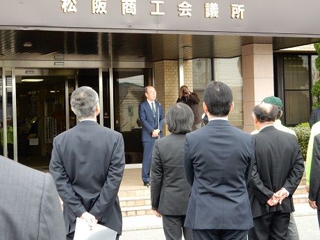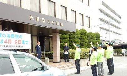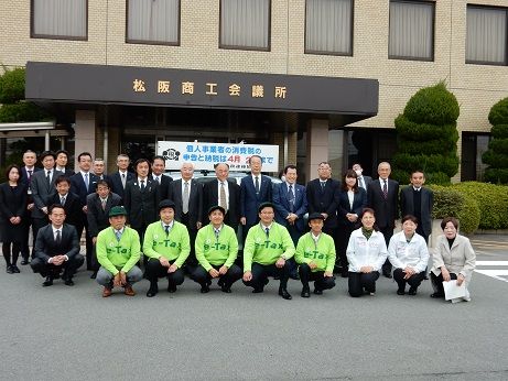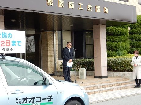 消費税申告広報パレード 本日、消費税申告広報パレードが行われております。 お天気が心配されましたが、雨が降ることもなく、春らしい温かさの中、朝から松阪商工会議所で出発式が執り行われました。 黄瀬間税会会長と岩間税連協会長、そして、e-taxボーイズの皆さんです 来賓の松阪税務署、横山総務課長よりご挨拶いただきました。