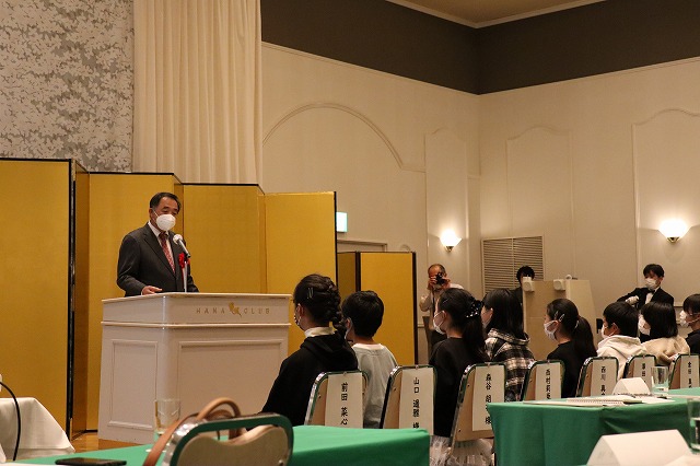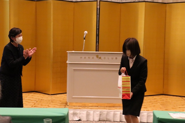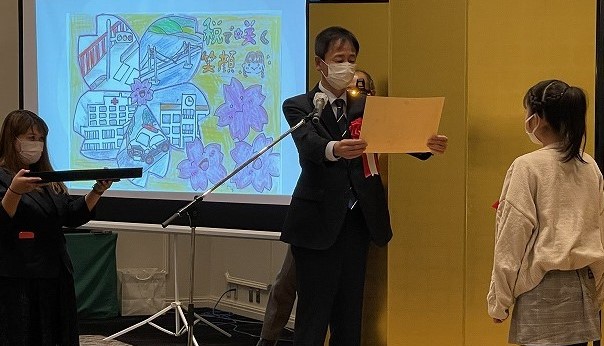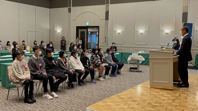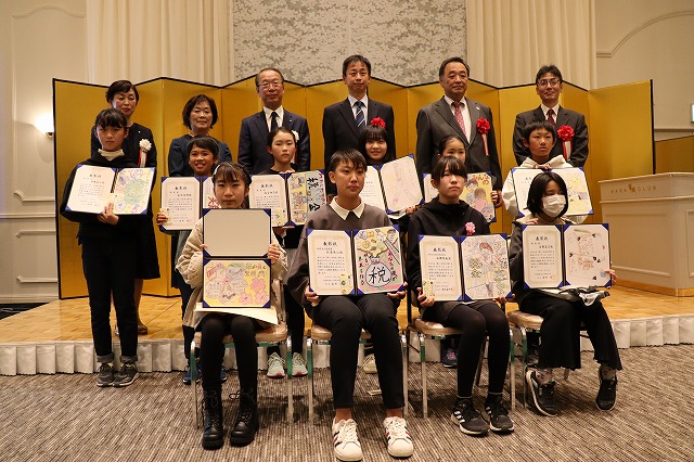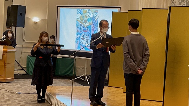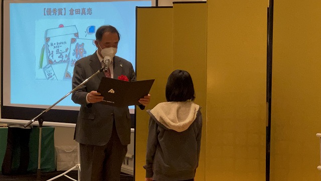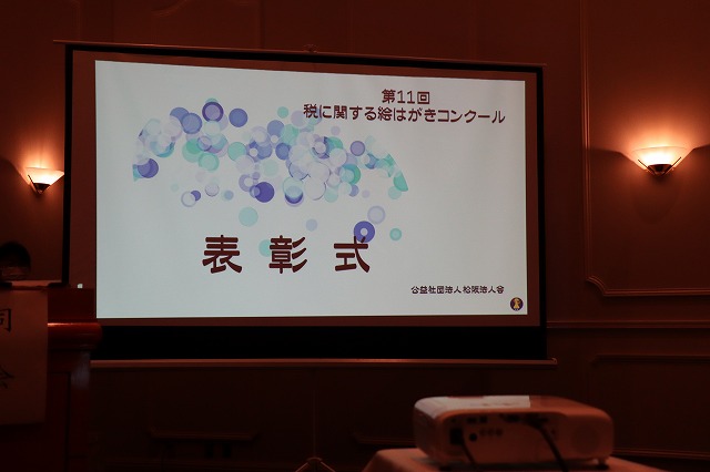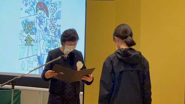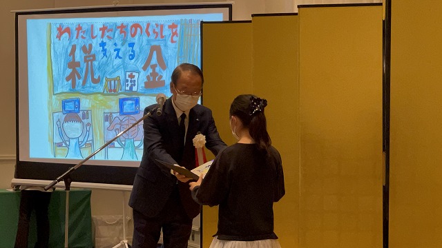 講演会後、今夏に開催した第11回絵はがきコンクール入賞者の表彰式を行いました。例年は11月初旬に開かれる税金展会場にて行うのですが、今年も新型コロナウイルス感染症感染防止の観点から中止となったため、この日に執り行いました。