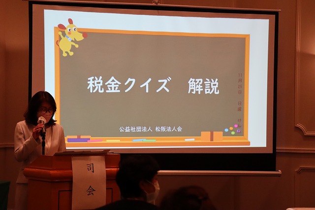 第2部では税金クイズの解説と表彰式を行いました。税金クイズは11月の「税を考える週間」事業の一環として、毎年10月に女性部が部会員に向けて行っているもので、今年も松阪税務署法人課税部門 山吉統括国税調査官に出題していただき、満点の方を表彰しました。