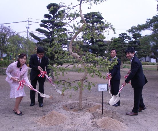 と 谷川会長らが木の根元にスコップで土を掛けられました。