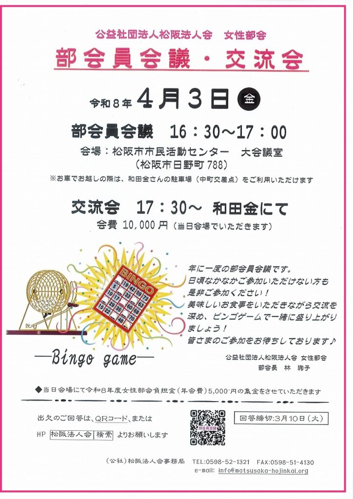 なお、当日会場にて令和8年度女性部会負担金(年会費)5,000円の集金をさせていただきます。